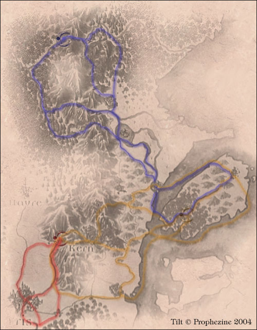 La route proposée est le col des monts des brumes, jusqu'à la cité de Kern, puis la traversée des marches Alysées pour atteindre l'île de Jaspor. Il faudra ensuite remonter un bras du fleuve l'Amante, jusqu'à la réunion du delta.